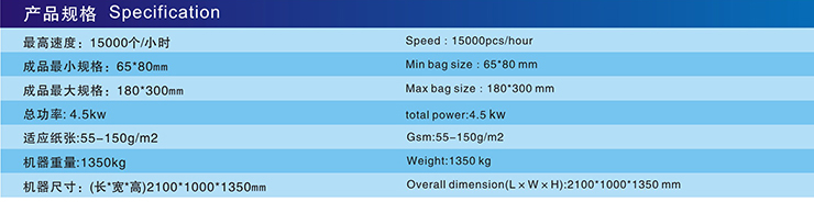 WF120型自動信封紙袋機作為系列產品的重要規格之一,主要用于加工中、小型信封,與我們其它型號的信封機一樣。WF120型自動信封紙袋機具有生產效率高,性能穩定,調整操作快捷方便,結構緊湊,占地面積小等優點。本機型的設計還特別考慮了厚紙加工的需要。氣吸式紙堆底部給紙機構分紙可靠,并可不停機續紙。配有吸氣滾筒的柵欄定位折疊機構高速穩定,折疊準確。可不停機調整信封(紙袋)的寬度,輪轉施膠機構可保證膠量均勻,清洗方便,配有成品計數分組機構。